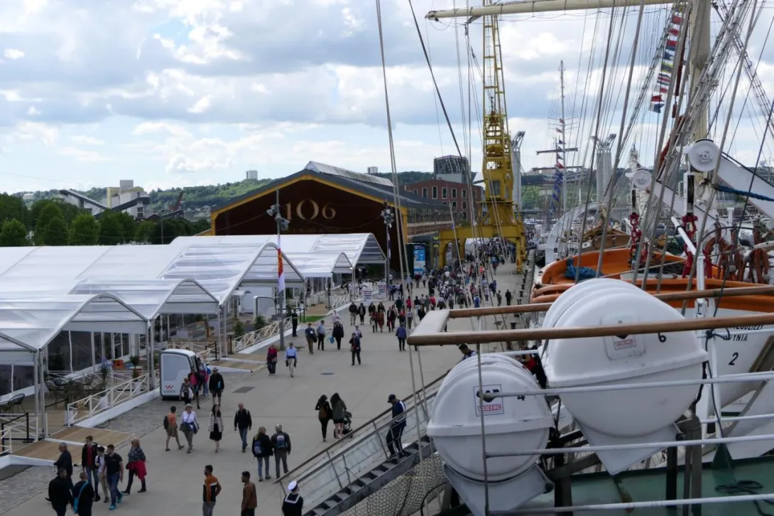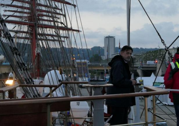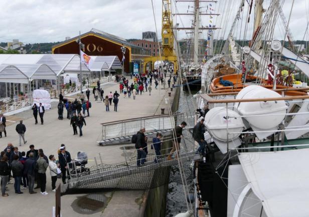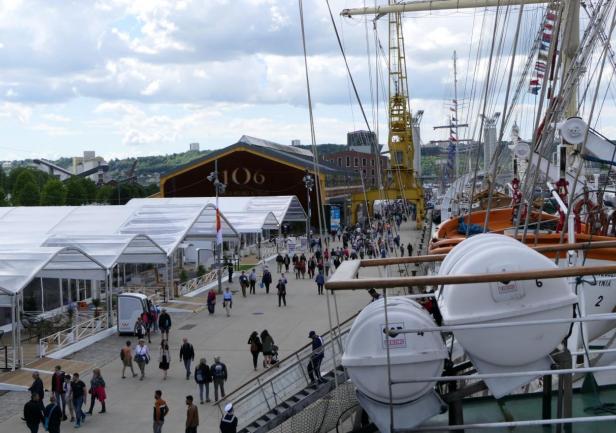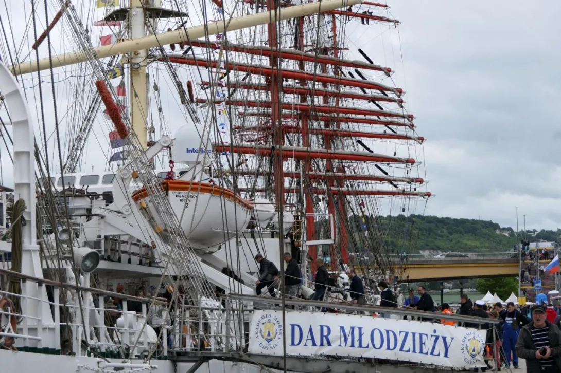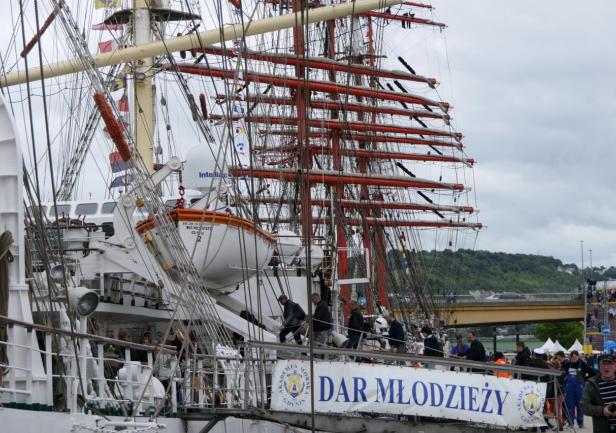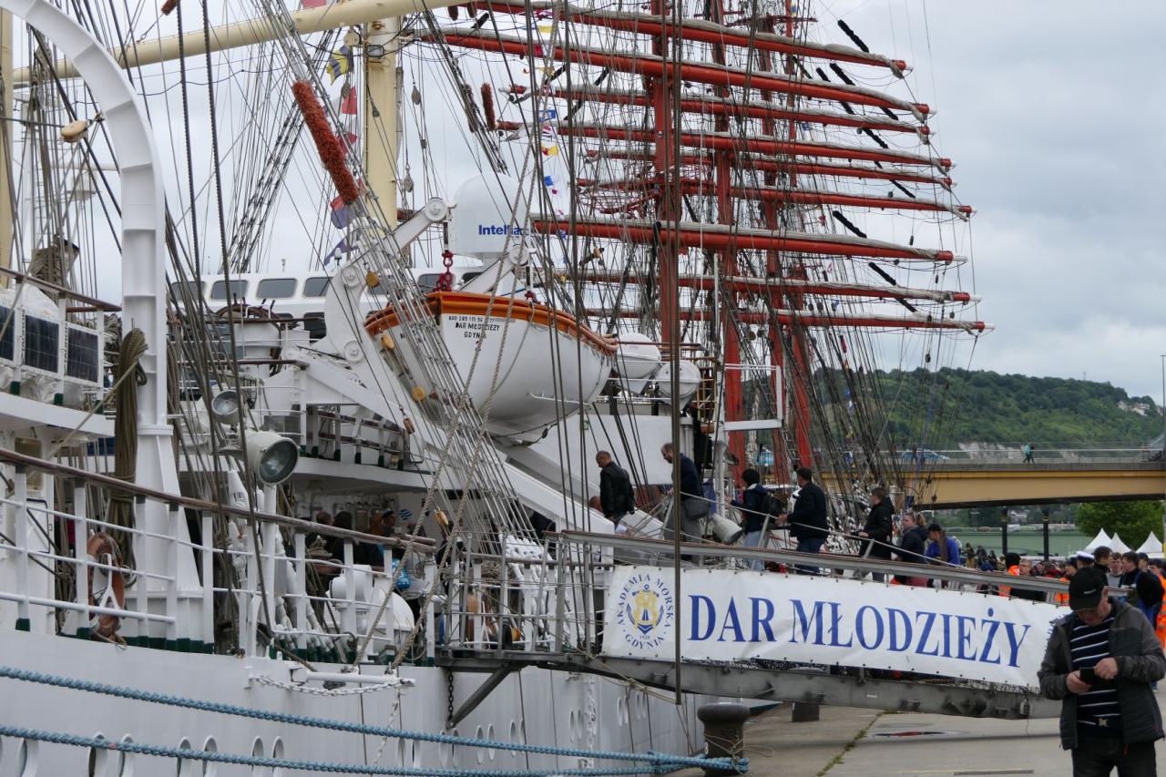 Na redę Le Havre dotarliśmy 05/06 wieczorem i przez cała noc płynęliśmy w górę Sekwany żeby o 0600 zacumować wśród największych żaglowców. Tuż za nami stoi „Siedow”, jest też „Mir”, „Kruzenshtern”, „Mircea”, „Shabab Oman II”, „Cisne Branco”, „Cuauthemoc”, „Belem” i wiele innych. Podobno ma być 50 statków. Żaglowce stoją blisko siebie po obu stronach Sekwany.