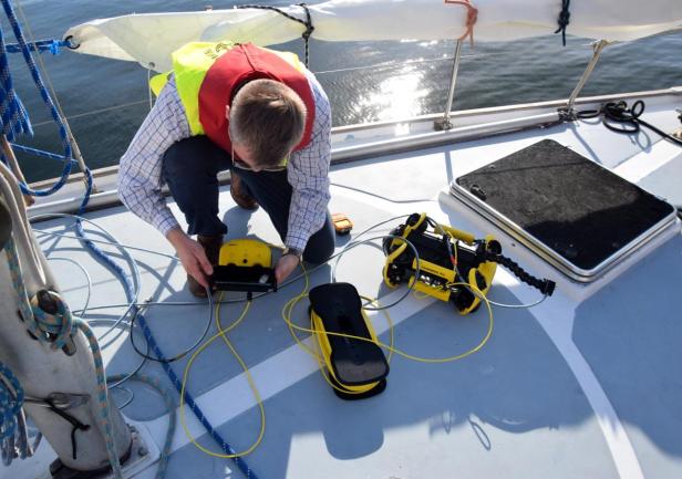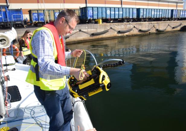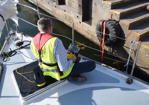 Natomiast dr inż. Adam Kaizer dokonał wstępnej kontroli grubości metalowej części ścianki Nabrzeża Roterdamskiego. Do tych badań użyto pojazd podwodny ROV.