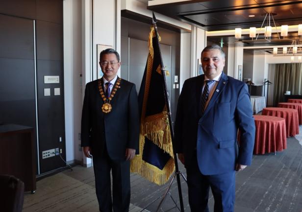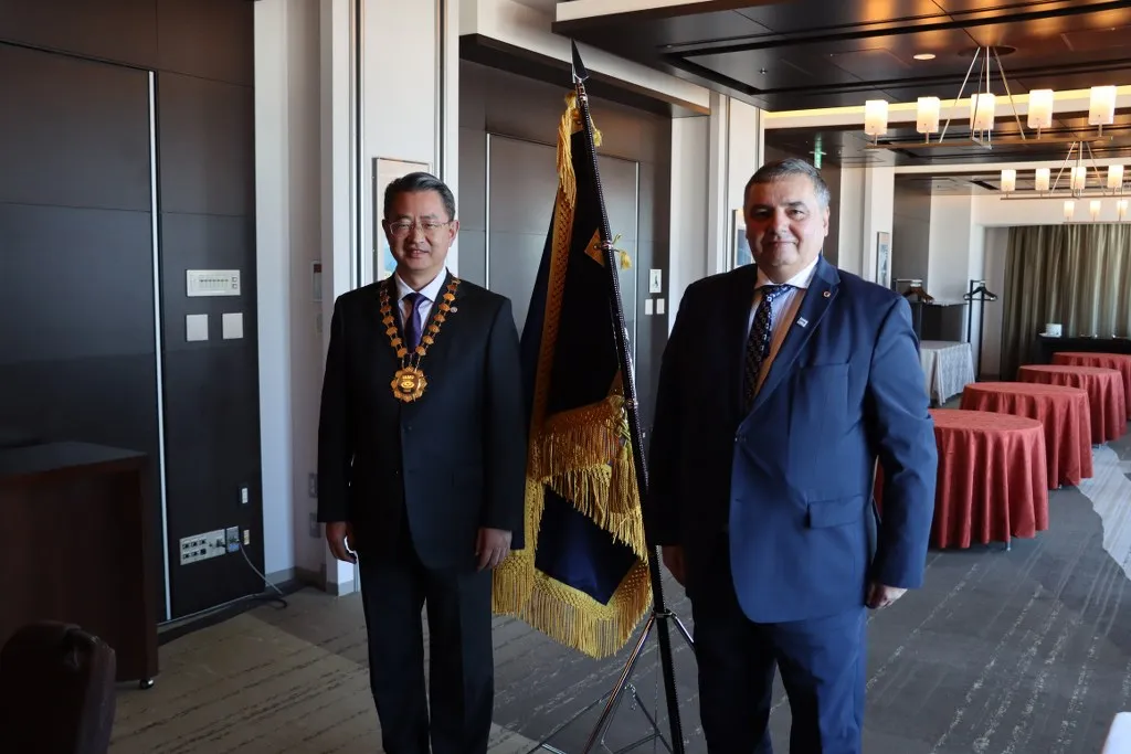 Przekazania insygniów władzy nowemu Przewodniczącemu Stowarzyszenia profesorowi SHAN Hongjun, rektorowi Dalian Maritime University w Chinach, dokonał Przewodniczący Międzynarodowego Stowarzyszenia Uniwersytetów Morskich IAMU w kadencji 2023-2025 JM Rektor Uniwersytetu Morskiego w Gdyni, prof. dr hab. inż. kpt. ż.w. Adam Weintrit.