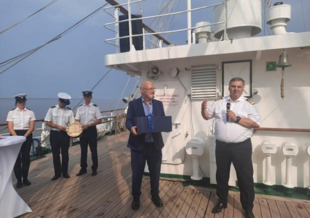 Następnie na ręce Rektora Hochschule Bremerhaven prof. Alexisa Papathanassisa JM Rektor prof. dr hab. inż. kpt. ż.w. Adam Weintrit na pamiątkę obchodów wręczył oryginalny bulaj z pokładu „Daru Młodzieży” oraz komplet porcelanowej zastawy według wzoru używanego na „Darze Młodzieży”.