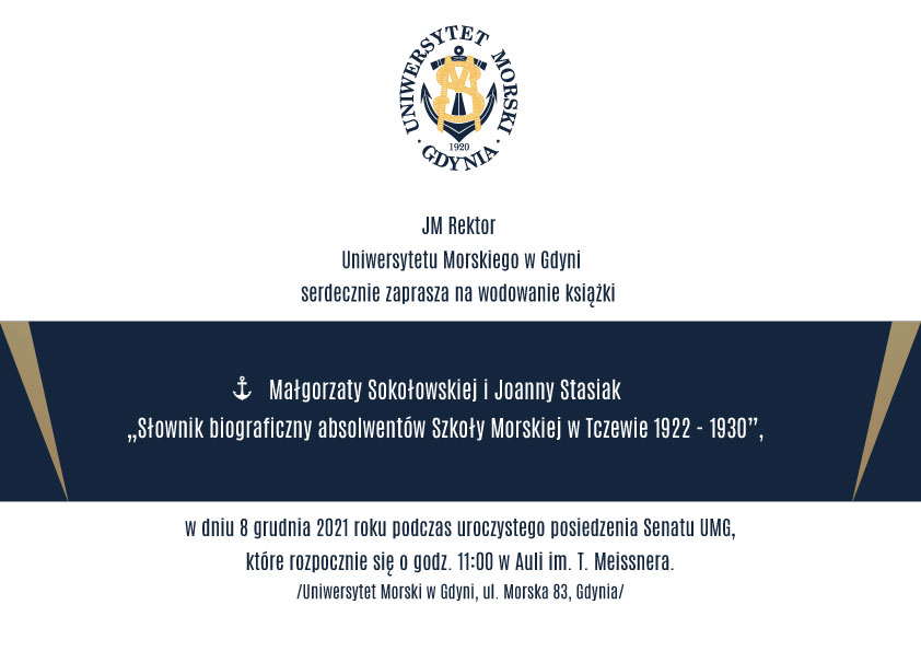 W dniu 8 grudnia 2021 roku podczas uroczystego posiedzenia Senatu UMG, które rozpocznie się o godz. 11:00 w Auli im. T. Meissnera odbędzie się wodowanie książki: Małgorzaty Sokołowskiej i Joanny Stasiak "Słownik biograficzny absolwentów Szkoły Morskiej w Tczewie 1922 - 1930".