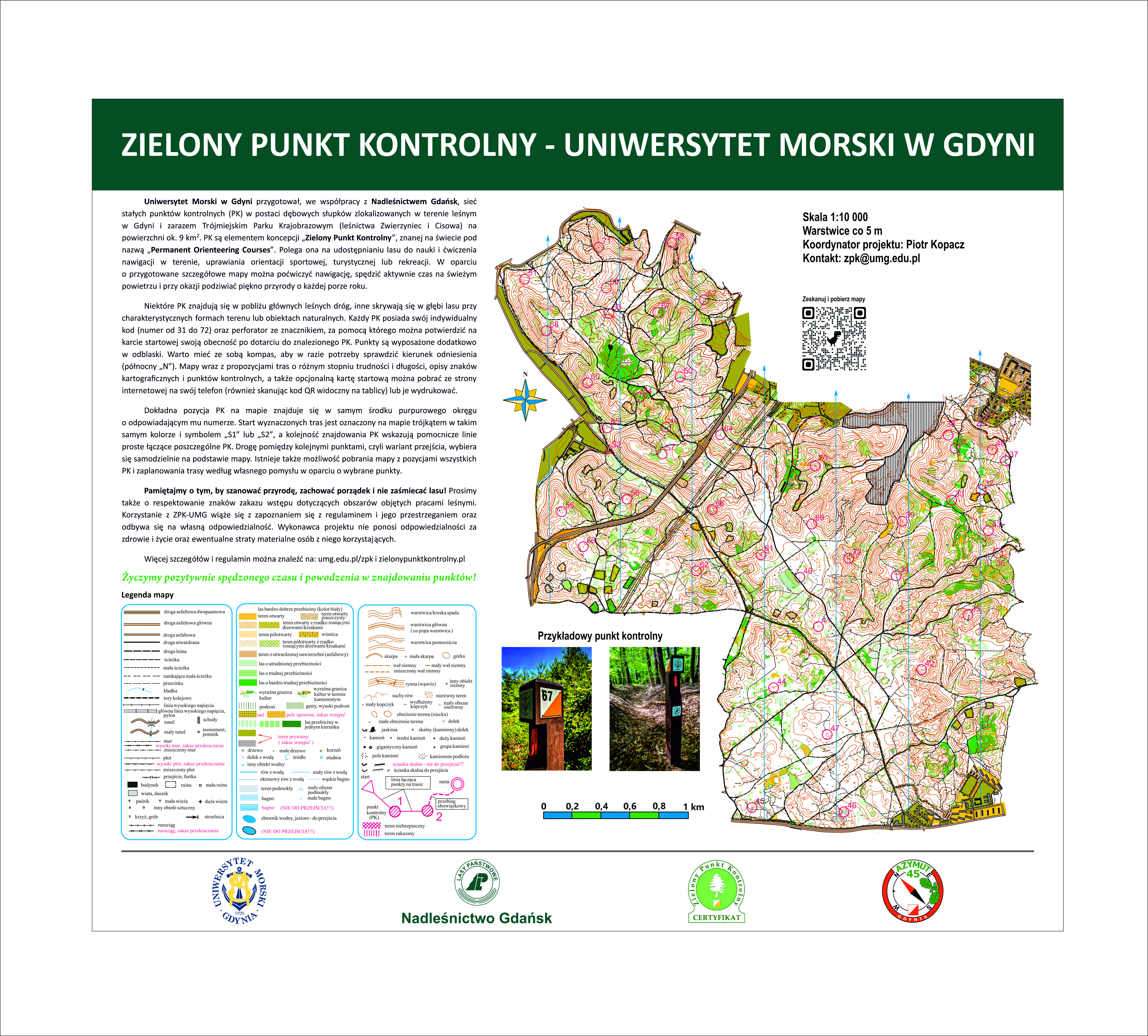 Uniwersytet Morski w Gdyni przygotował, we współpracy z Nadleśnictwem Gdańsk, sieć stałych punktów kontrolnych (PK) w postaci dębowych słupków, zlokalizowanych w terenie leśnym na powierzchni ok. 9 km2 w obrębie Gdyni (leśnictwa Zwierzyniec i Cisowa). PK są elementem koncepcji "Zielony Punkt Kontrolny" (ZPK), znanej na świecie pod nazwą "Permanent Orienteering Courses". Polega ona na udostępnianiu lasu do nauki i ćwiczenia nawigacji w terenie, uprawiania orientacji sportowej, turystycznej lub rekreacyjnej, w tym rozwijania umiejętności poprawnego czytania mapy oraz rozumienia jej ograniczeń. Korzystając z przygotowanych szczegółowych map, mogą Państwo poćwiczyć nawigację, spędzić aktywnie czas na świeżym powietrzu i przy okazji podziwiać piękno przyrody o każdej porze roku.